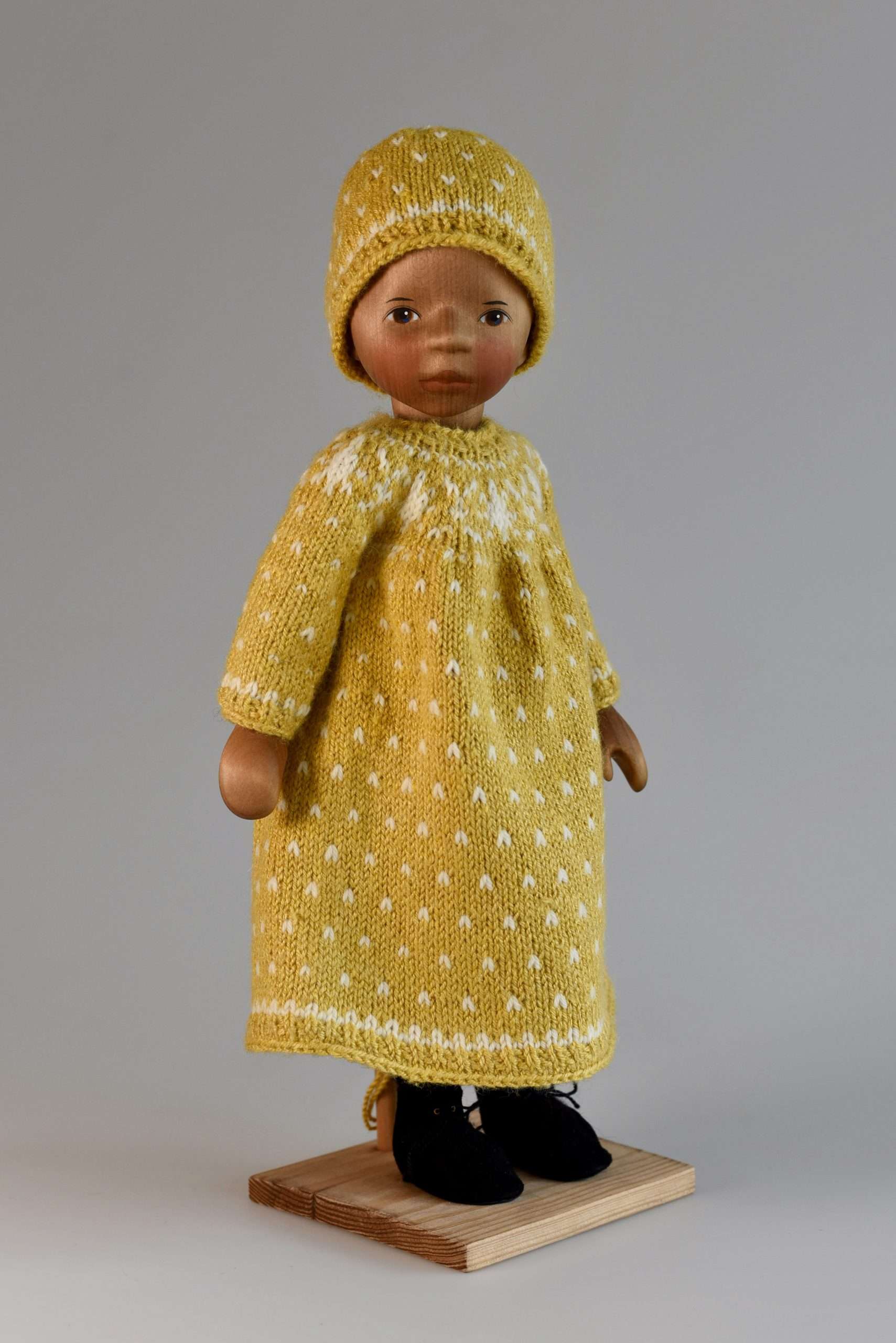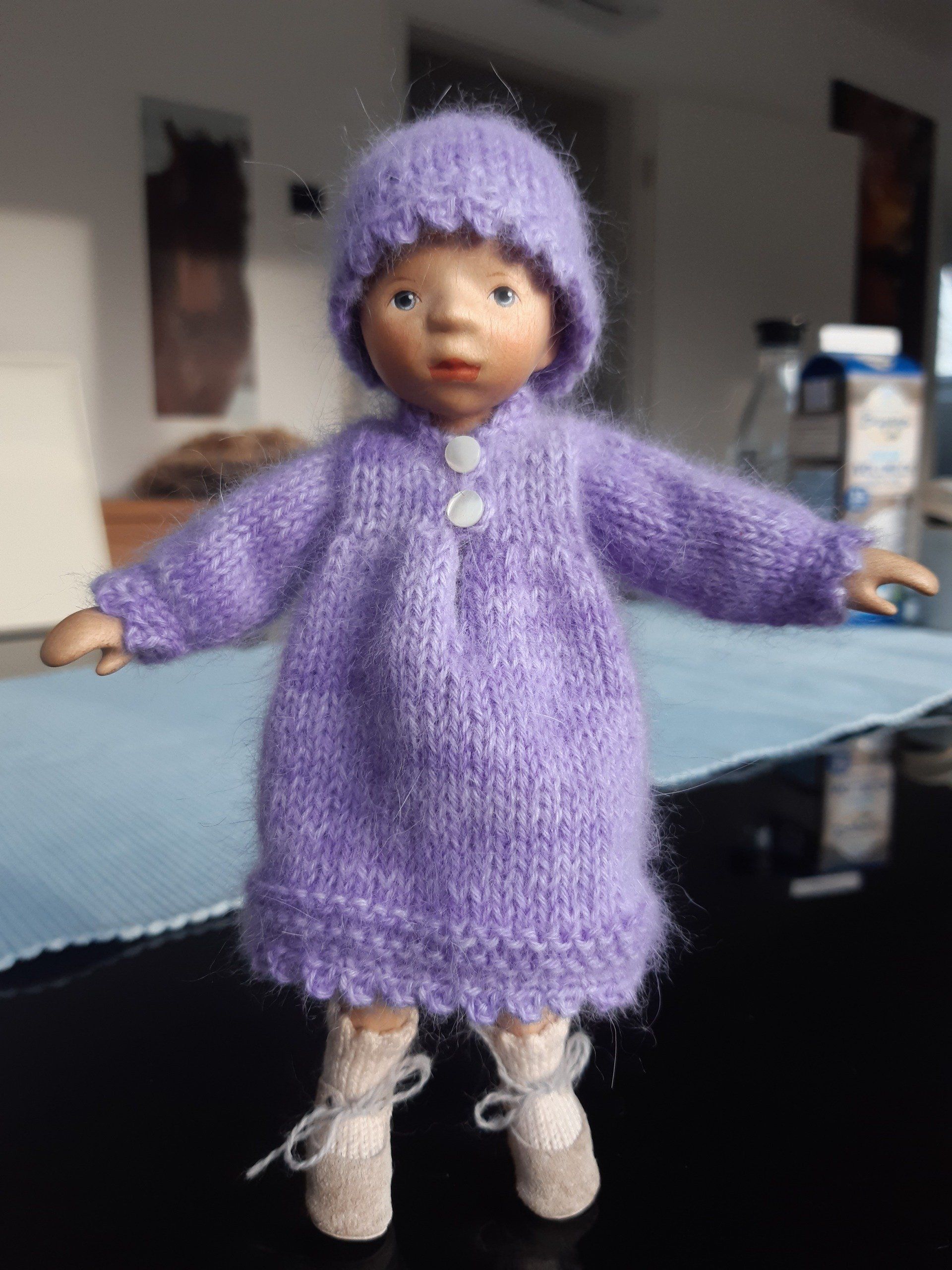 Eine echte Herausforderung war das kleinste Holzpuppenmodell der Familie Pongratz, 15cm und doch alles dran und genauso beweglich, wie die großen Puppen. Das Kleidchen ist aus 100% Angora-Wolle der Firma "Seidenhasen" (www.seidenhase.de) von glücklichen Hasen aus Thüringen ;) Die Wolle ist einfach ein Traum! Das alte Modell wurde mit einer anderen Nadelstärke und Handstrickmaschine gestrickt (habe ich aber nicht!):