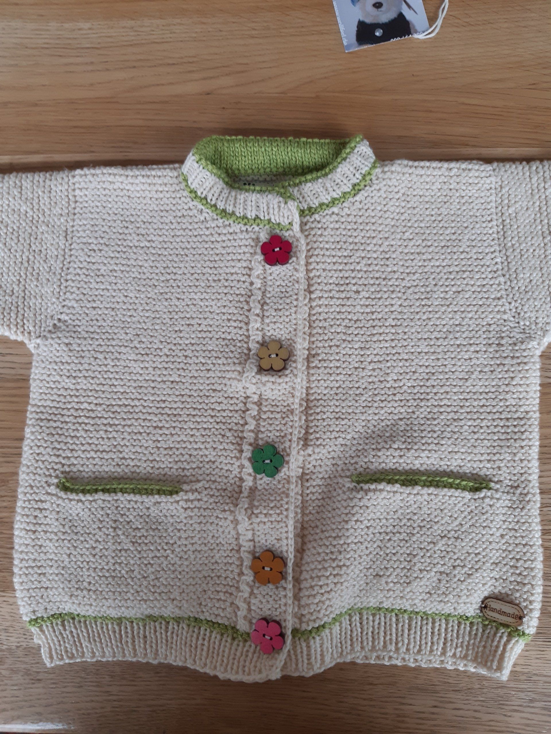Die Idee spuckte mir schon lange im Kopf: die perfekte Säuglings- oder Neugeborenenjacke. Alle Erfahrungen sollten einfließen. Für das erste Modell wurde ungefärbte Merinowolle von Seehawer Naturfasern (www.naturfasern.com) (mit Nadelstärke 3) verwendet. Die gesamte Jacke ist ohne Naht gestrickt, nur das Ärmelbündchen wird aus dem Saum aufgeschlagen. Die Ärmel werden gleich mit aufgeschlagen. Vorne wird sie als Wickeljacke gebunden, zum einen ist damit der "Einstieg", das Anziehen einfacher. Außerdem gibt es keine störenden Knöpfe. Der Bauch bleibt schön warm und das Kind kann auch mal auf diesen gedreht werden. Wem das zu "farblos" ist, kann die Jacke auch entsprechend blau/rosa/bunt/... umhäkeln (lassen)...