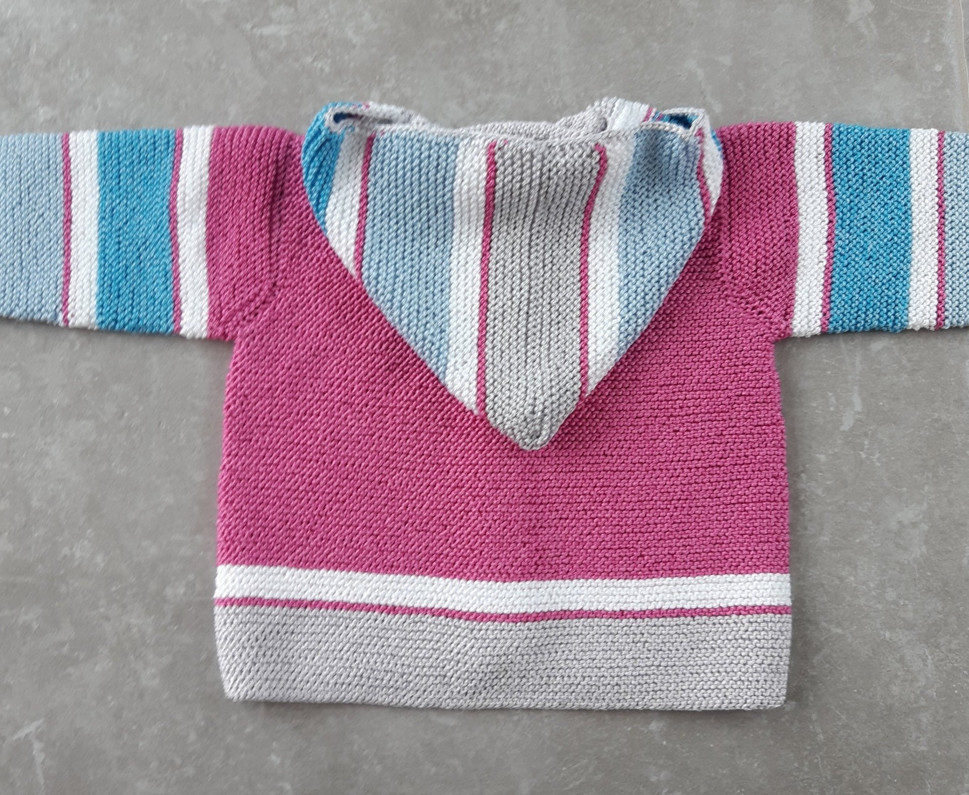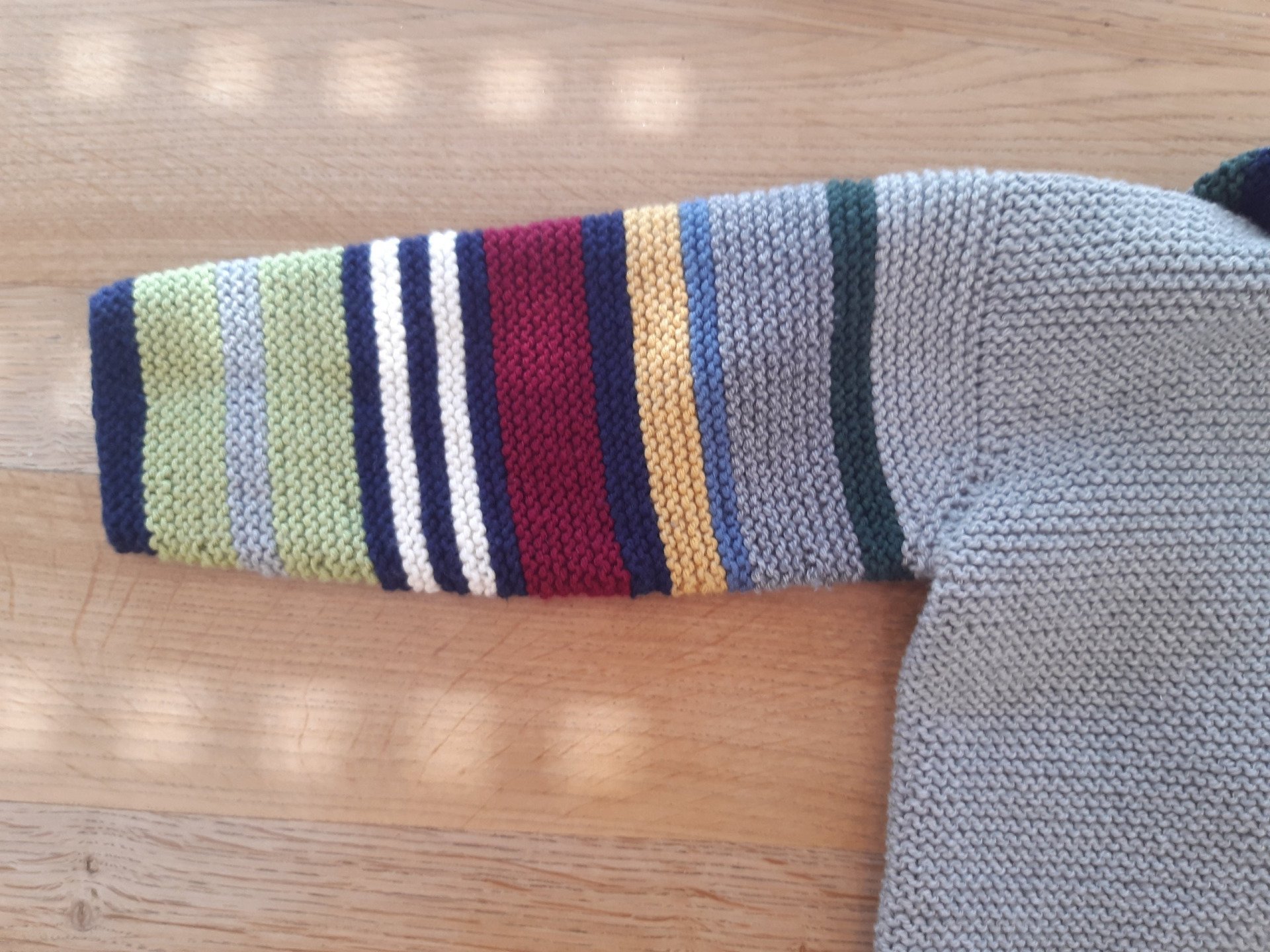 Zwischendurch wollte ich mal wieder meiner besonderen Vorliebe für geringelte Jacken frönen (Zum Teil sind es nur Werkstattbilder, aber so kann man auch gleich die Fertigungsweise sehen). Die graue Kapuzenjacke ist eine Bestellung: