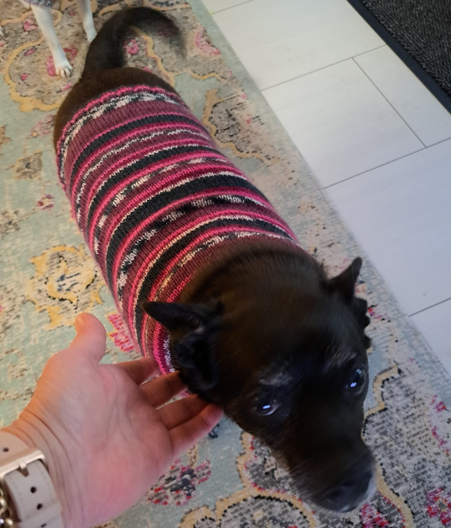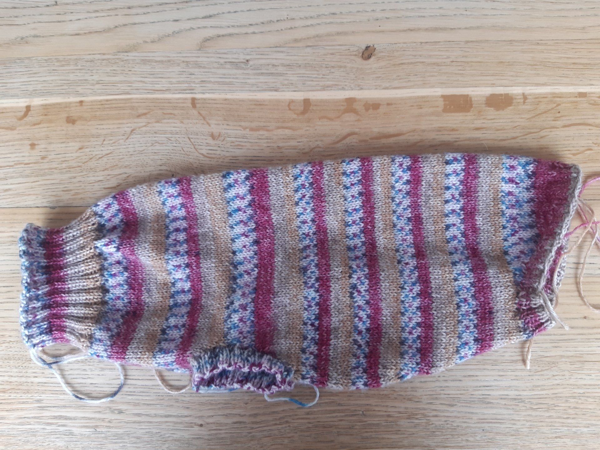 Lange habe ich gegrübelt, ob ich einen neuen Unterpunkt daraus gestalte, aber vielleicht war es ja nur "einmalig" in jeglicher Hinsicht... ich habe zwei Hundemäntelchen nach Maß gestrickt: Erst einmal Danke an die hervorragende Messarbeit (sicherlich kein leichtes Unterfangen) und dann das Zugeständnis: Es hat wirklich viel Spaß gemacht! Ich habe mich für 6fädige Sockenwolle entschieden, weil es schöne Farbverläufe gibt, die Wolle warm hält (vor allem den Bauch) und dabei das Material gut waschbar und stabil ist.