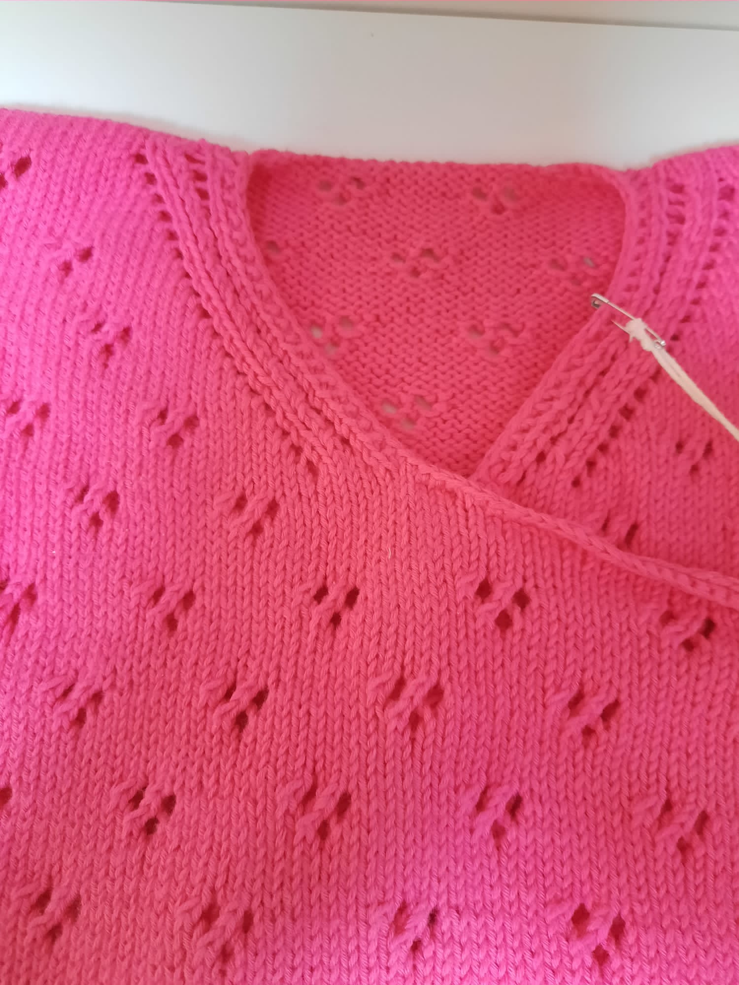 Das beige Kurzteil ist aus 50%BW 50%Viscose, weil ich ein glänzendes Garn haben wollte. Häkeln kann und wollte ich nicht; deswegen ein schönes Lochmuster in Absprache mit der Kundin.